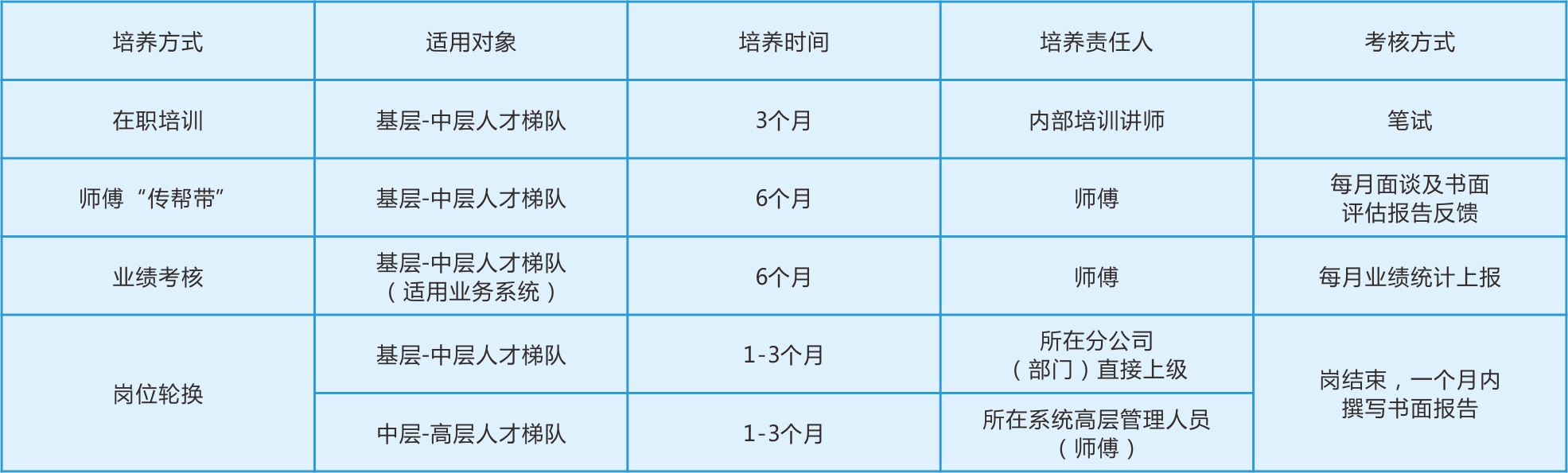 1、將一批有發(fā)展潛質(zhì)的人才納入公司實(shí)施的人才培養計劃,發(fā)揮梯隊人才中堅力量的作用。 2、指導與規范后備人才梯隊的培養工作,建立后備人才的培養機制。3、與企業(yè)發(fā)展戰略同步,使企業(yè)在需要時(shí)有人可用。